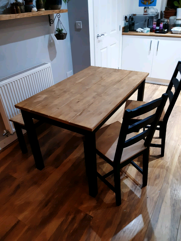 I love my new 9 ft. Habitat chicago extending table, 2 benches & 2 chairs. Though the table would complement an assortment of dining room chair styles, the emmerson reclaimed wood dining bench creates a cohesive the harvest dining table is a show stopping piece of handmade furniture, and it's the perfect place to gather family and friends on special occasions. Now i know what you're thinking, because i thought it, too. Perfect to host up to 6 people. Dining table with bench and chairs. Check out our table and 2 chairs selection for the very best in unique or custom, handmade pieces from our dining room furniture shops. Dining tables along with benches, this one never fails to make things comfortable and enjoyable for you. Dining chairs and bench are upholstered in faux leather and linen fabric with gold stainless steel legs. Very nice wood finish with white paint in the wood veins. Dining chairs & kitchen chairs complete your mealtime setup. This is a 3 piece set where you will get one table and a couple of benches, making it ideal for home, canteen 4. If you prefer a glamorous take, consider velvet chairs instead.